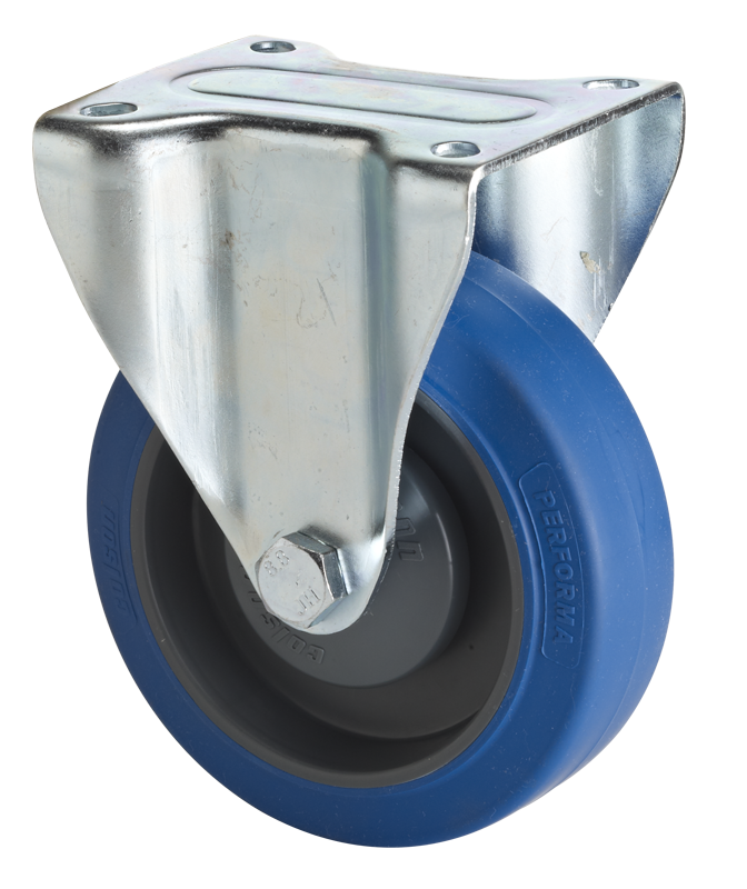 - Dark grey Polypropyleene wheel with a blue elasticrubber tyre (Performa, Shore A 65 - 70) with one deep groove ball bearing