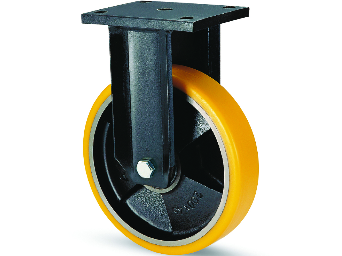 - Gußrad mit aufvulkanisierter Polyurethanbereifung (Shore A 92) und zwei Kegelrollenlagern