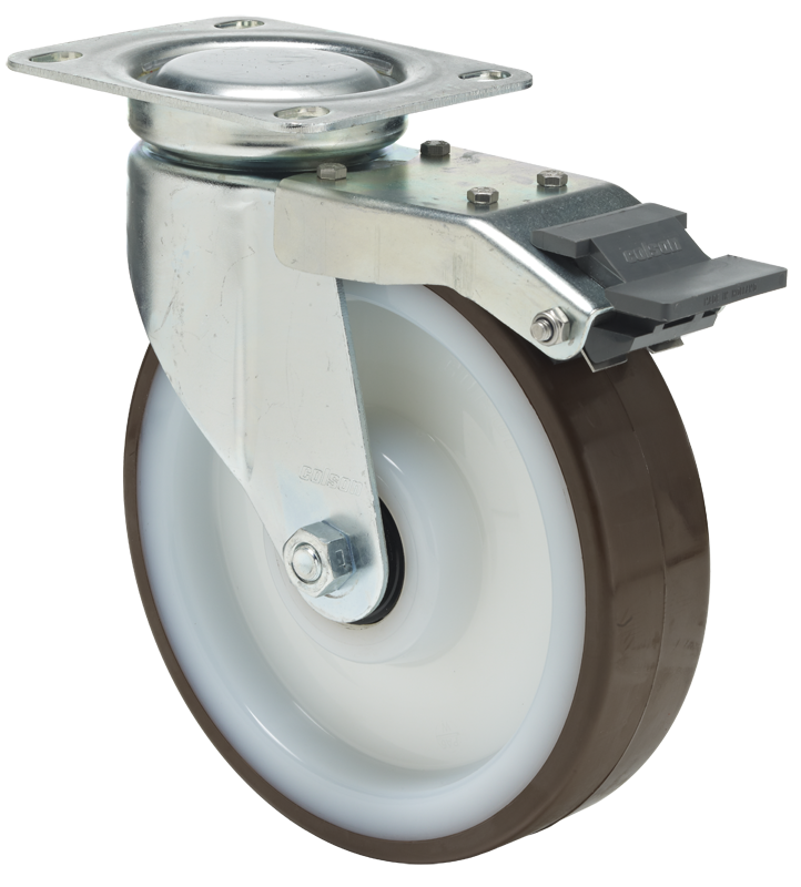 - Swivel fork of deep drawn zinc-coated steel with wheel brake. Swivelhead with sealed precision