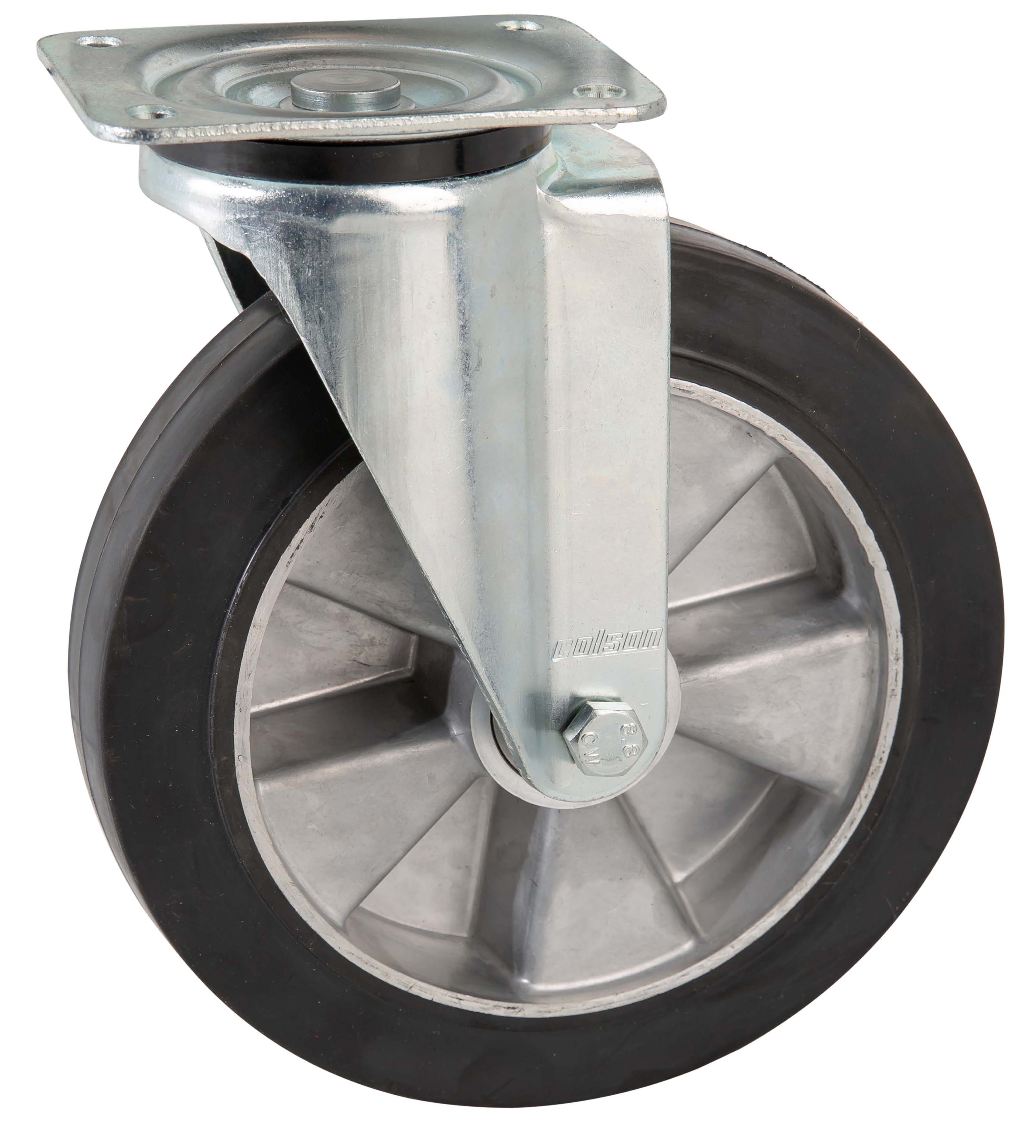 - Aluminium wheels with black rubber tyre (Shore A 72) with two deep groove ball bearings and steel collar bushes external diameter 15/20/25 mm to internal 8/10/12 mm. Operating temperatures from -20°C to + 80°C