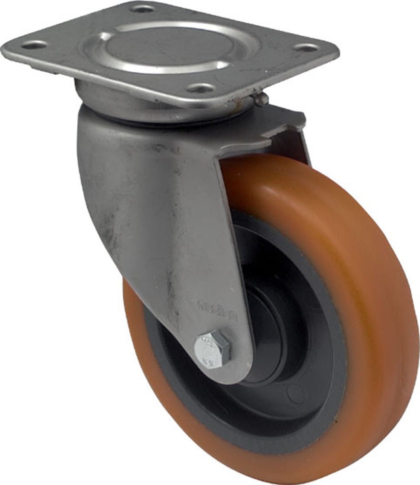 - Swivel fork of deep drawn stainless steel with wheel brake.