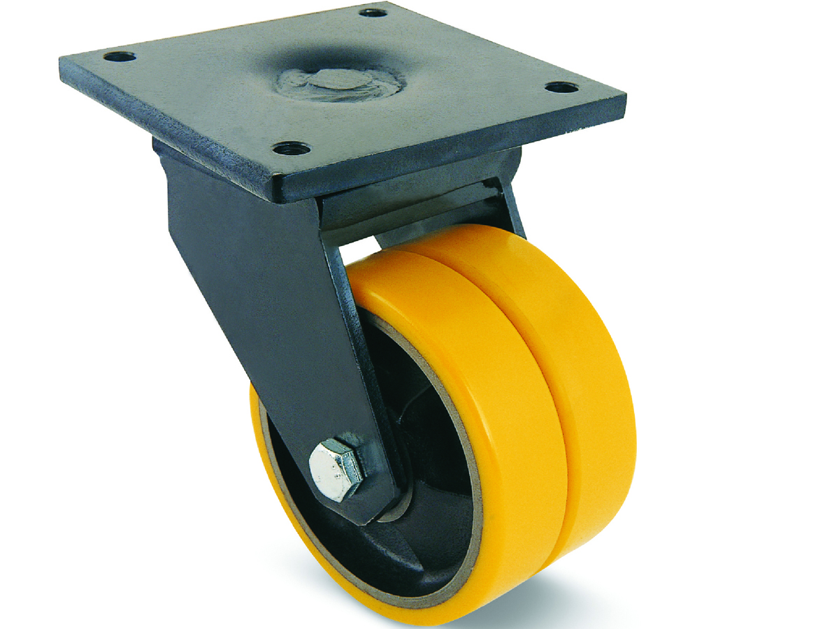 - Heavy duty swivel fork for dual wheels, in extra thick pressed and welded steel. With a tapered roller bearing in the swivel head, black lacquered.