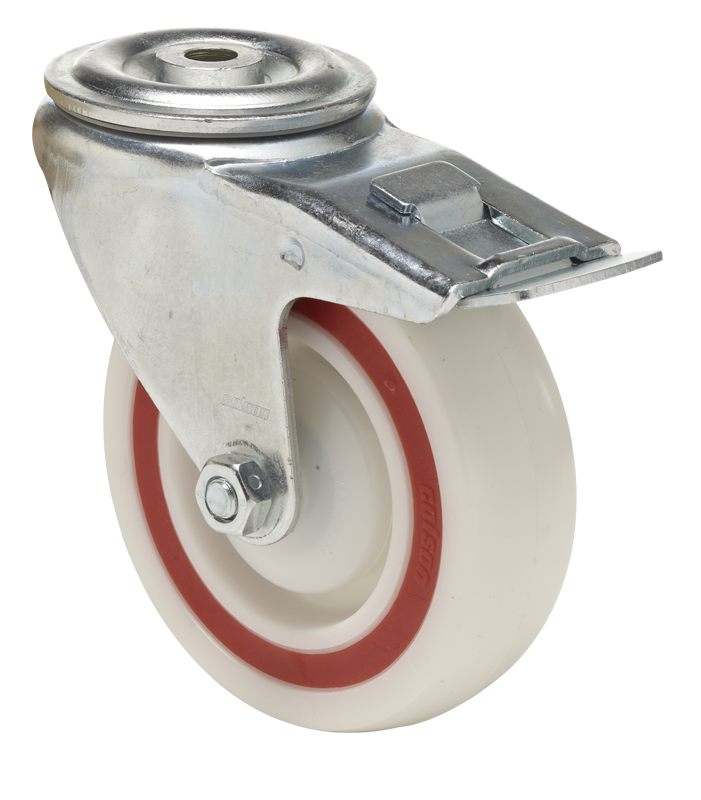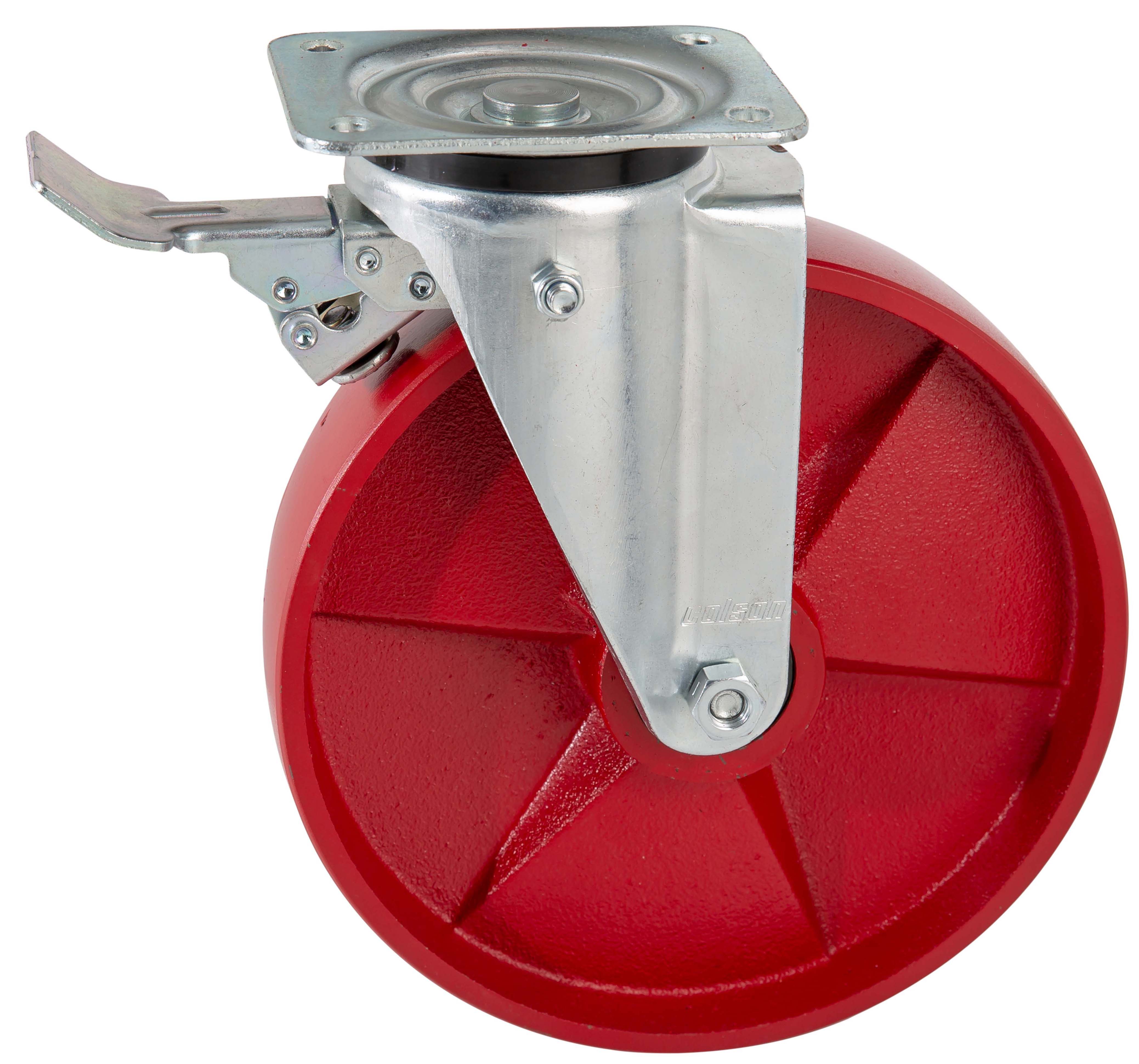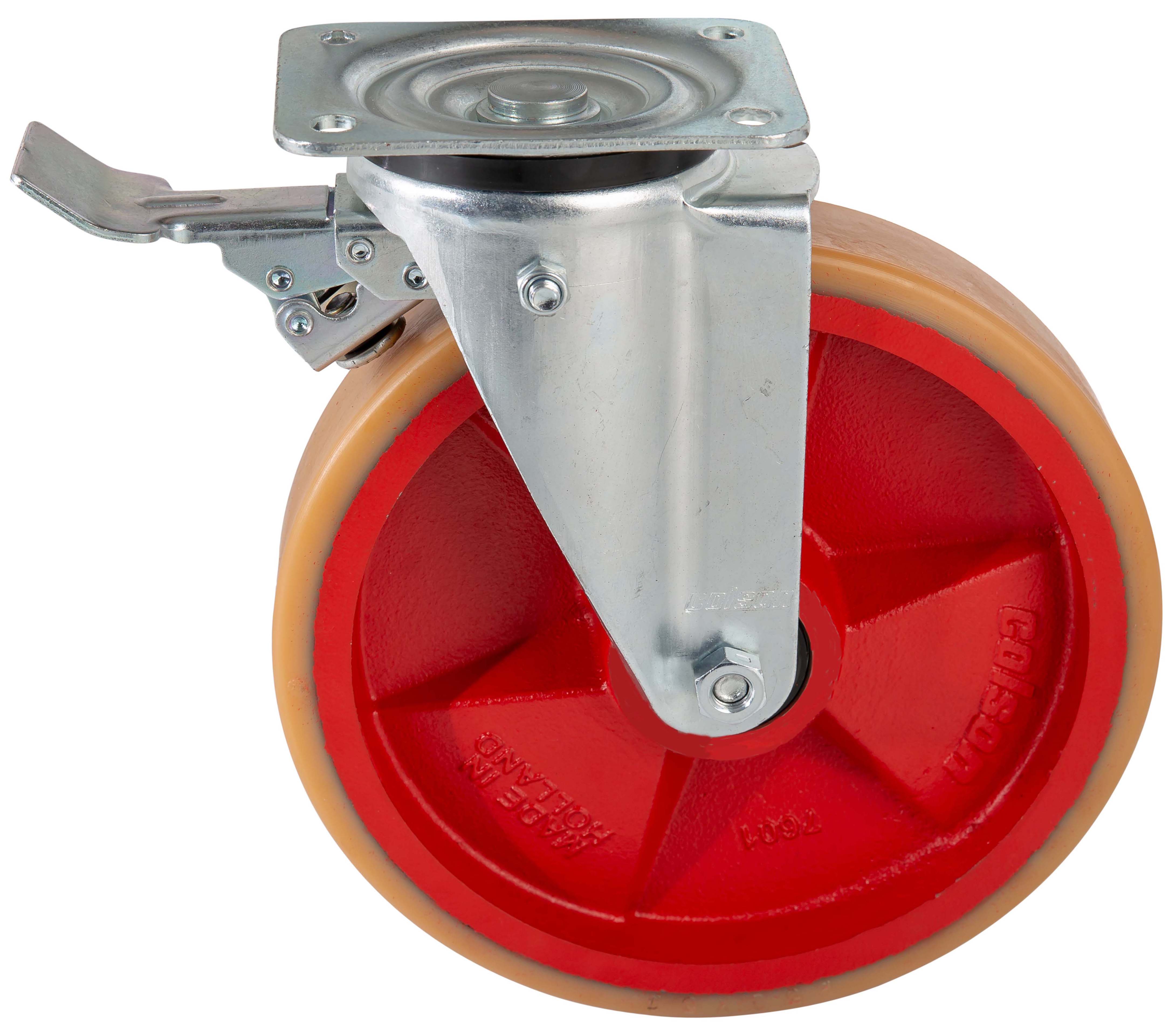 - Cast iron wheel with bonded-on Vulkollan tyre (Shore A 92) with two ball bearings