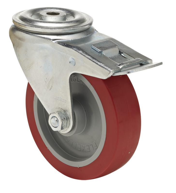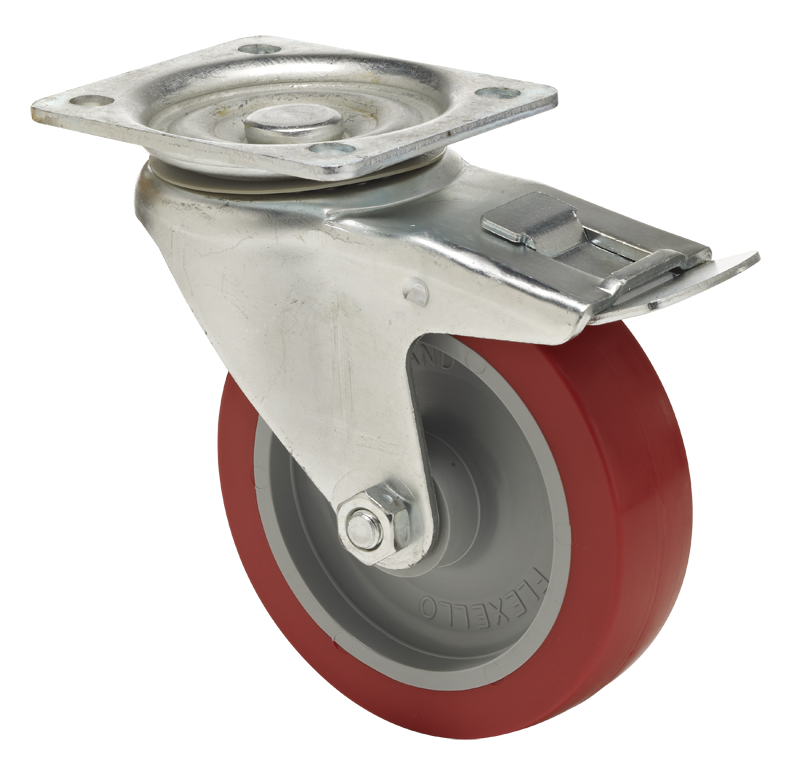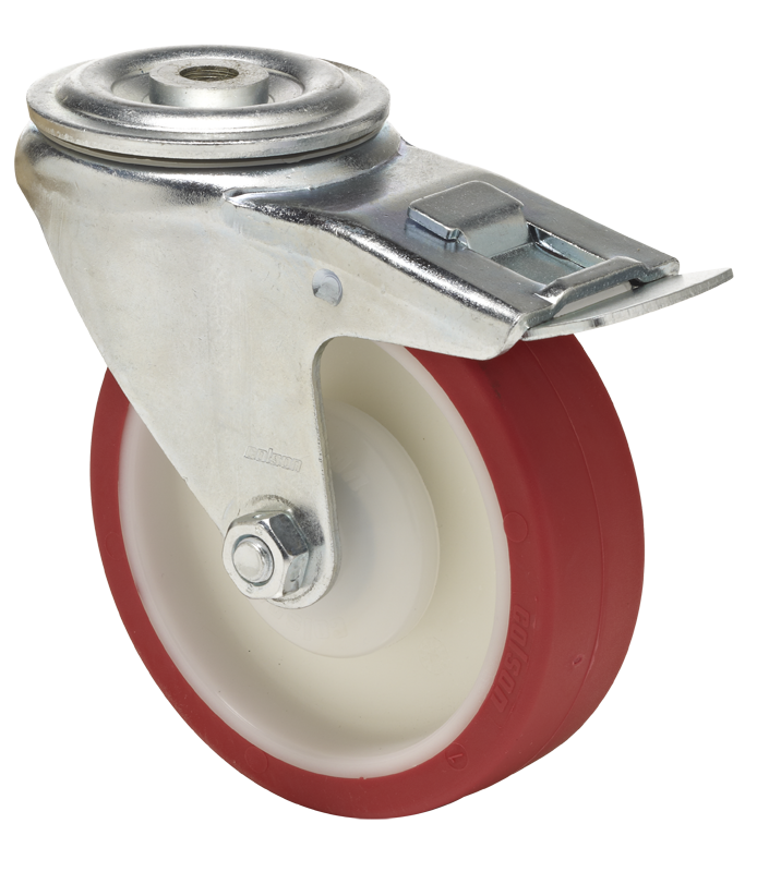 - Dark grey Polypropyleene wheel with a blue elasticrubber tyre (Performa, Shore A 65 - 70) with one deep groove ball bearing