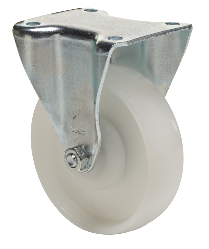 - Dark grey Polypropyleene wheel with a blue elasticrubber tyre (Performa, Shore A 65 - 70) with one deep groove ball bearing