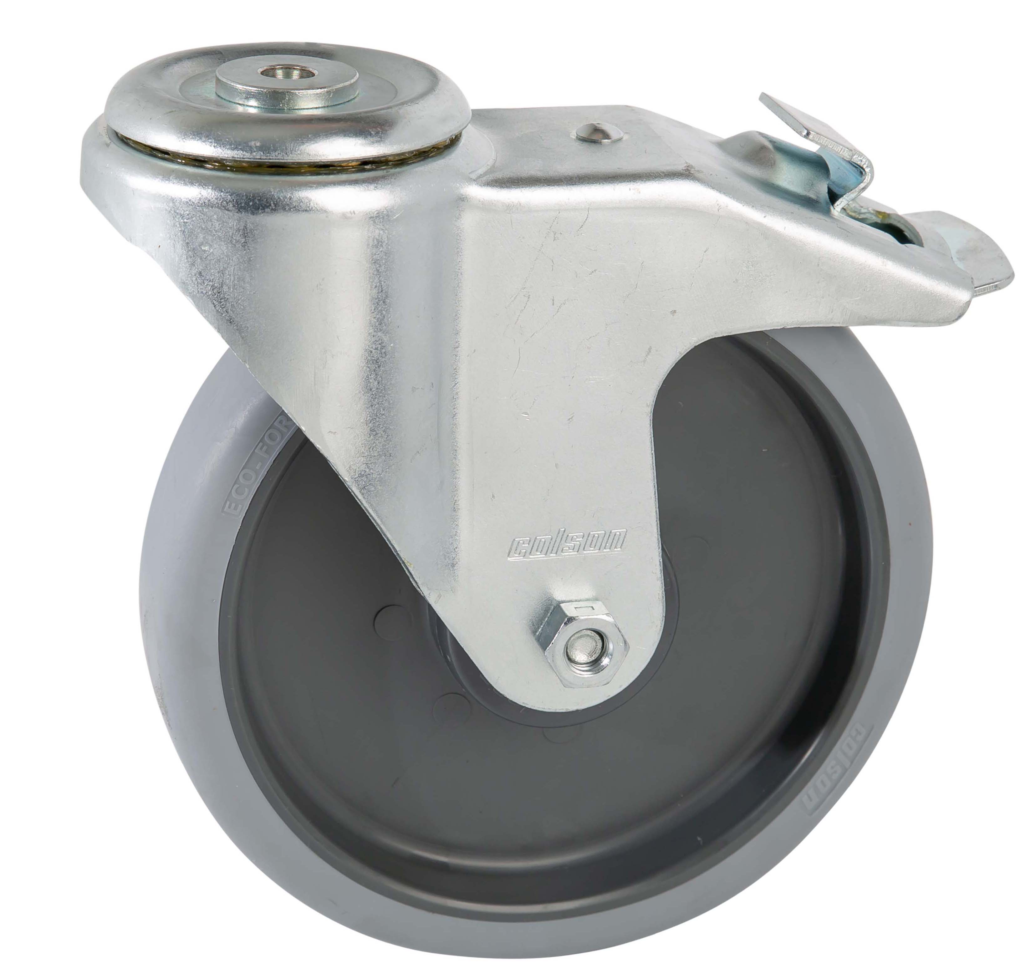 - Swivel fork of deep drawn zinc-coated steel with bolt hole fitting and total brake