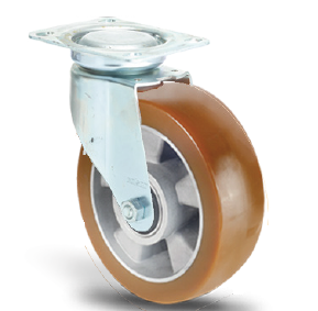 - Aluminium wheels with bonded-on round polyurethane tyre (Shore A 92) with two deep groove ball bearings and steel collar bushes external diameter 15/20/25 mm to internal 8/10/12 mm. Operating temperatures from -20°C to + 80°C