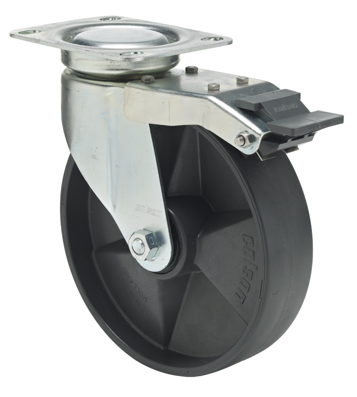 - Swivel fork of deep drawn zinc-coated steel with wheel brake. Swivelhead with sealed precision