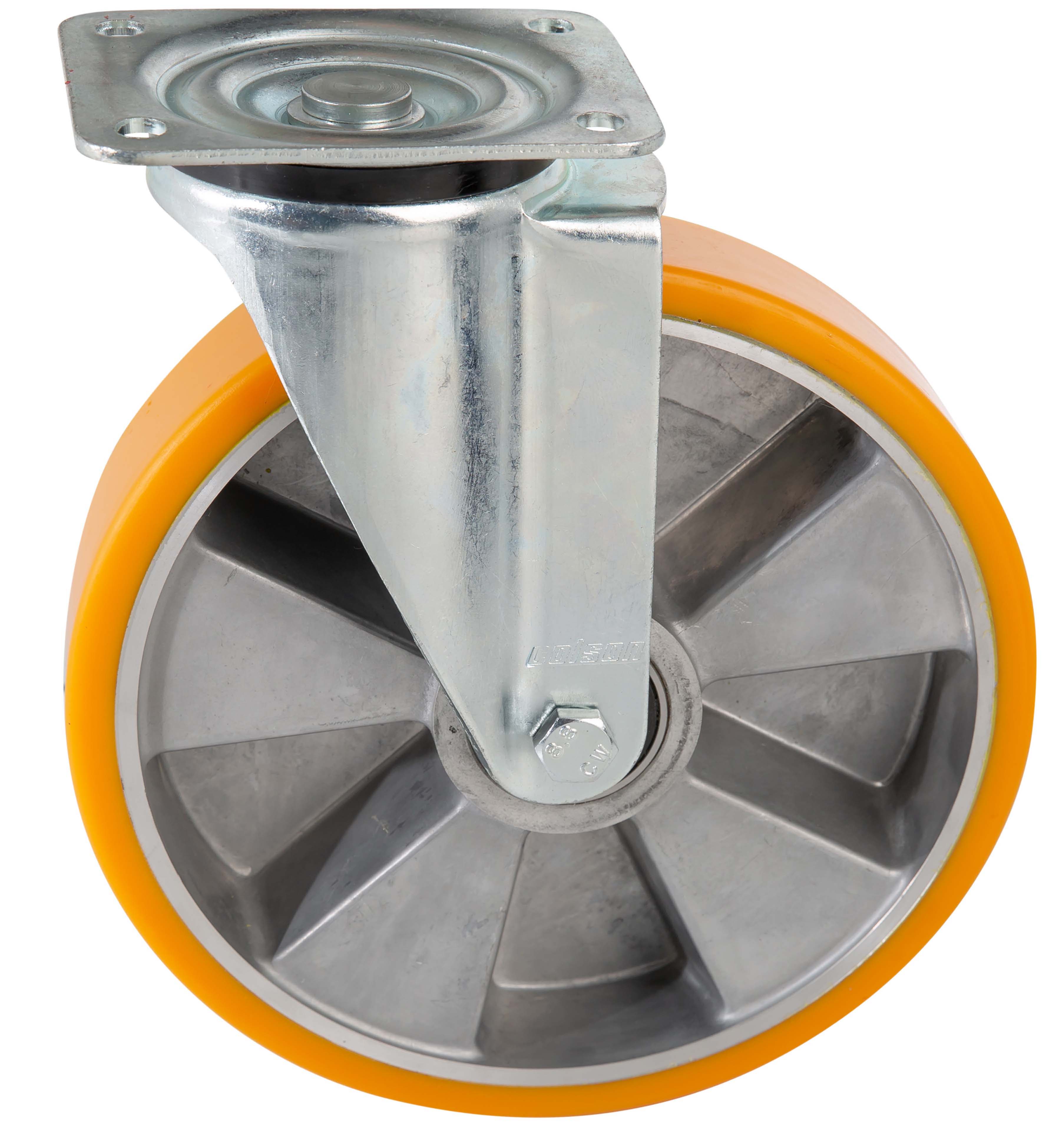 - Aluminium wheels with bonded-on polyurethane tyre (Shore A 92) with two deep groove ball bearings and steel collar bushes external diameter 15/20/25 mm to internal 8/10/12 mm. Operating temperatures from -20°C to + 80°C
