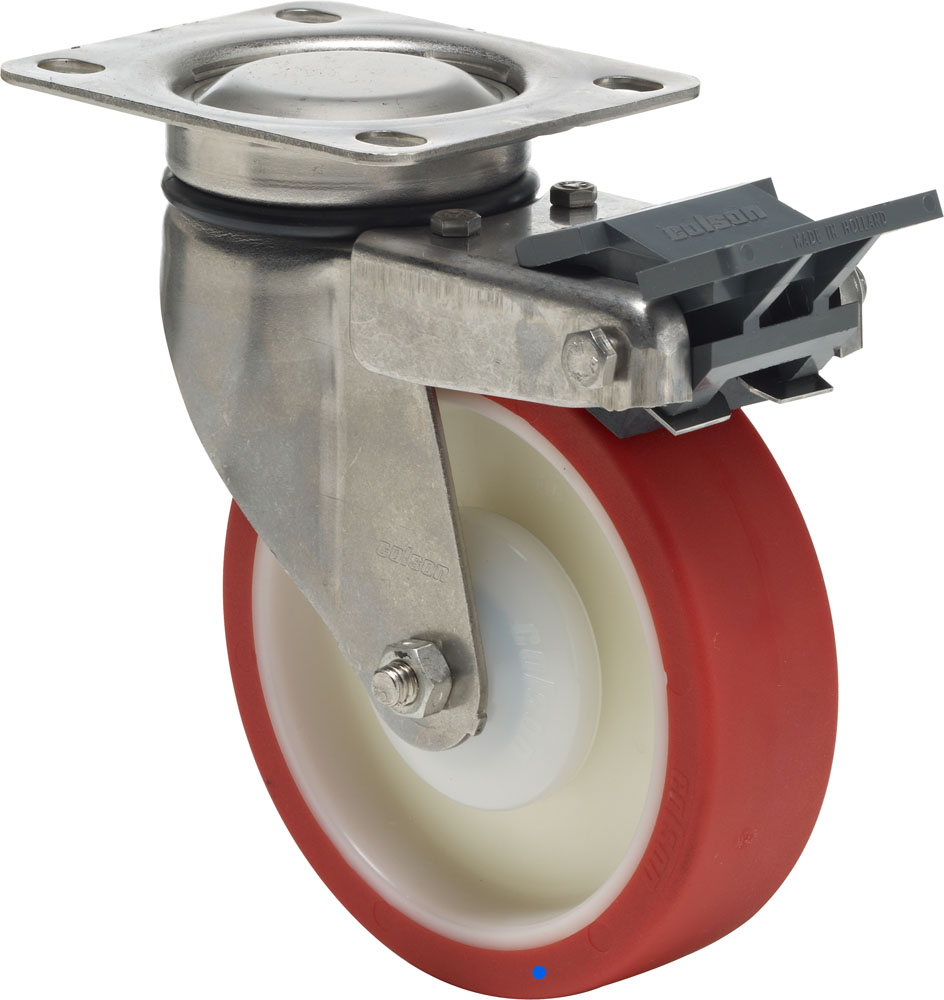 - Swivel fork of deep drawn stainless steel with wheel brake.