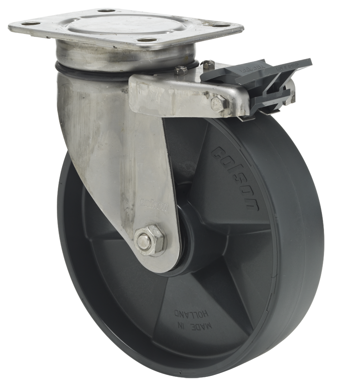 - Swivel fork of deep drawn stainless steel with wheel brake.