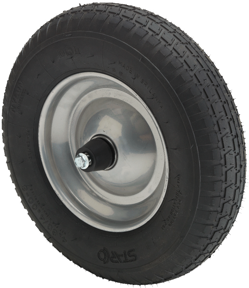 - Black pneumatic wheel with a grey metal rim