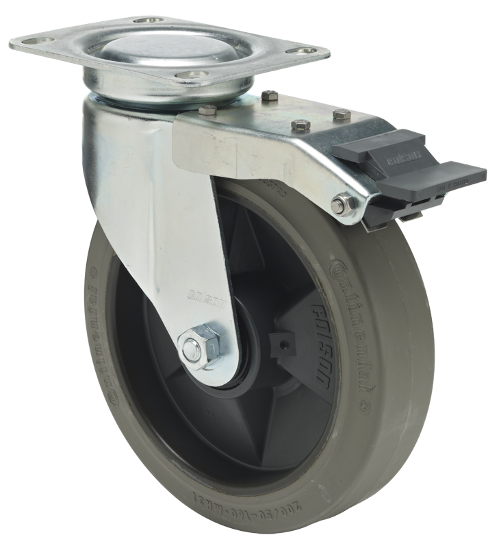 - Swivel fork of deep drawn zinc-coated steel with wheel brake. Swivelhead with sealed precision