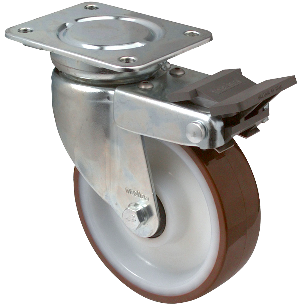 - Swivel fork of deep drawn zinc-coated steel with wheel brake. Swivelhead with sealed precision