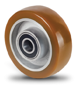 - Aluminium wheels with bonded-on round polyurethane tyre (Shore A 92) with two deep groove ball bearings and steel collar bushes external diameter 15/20/25 mm to internal 8/10/12 mm. Operating temperatures from -20°C to + 80°C
