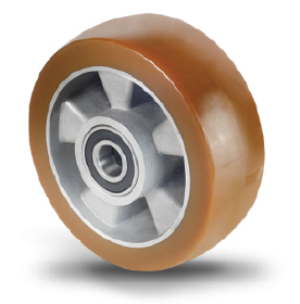 - Aluminium wheels with bonded-on round polyurethane tyre (Shore A 92) with two deep groove ball bearings and steel collar bushes external diameter 15/20/25 mm to internal 8/10/12 mm. Operating temperatures from -20°C to + 80°C