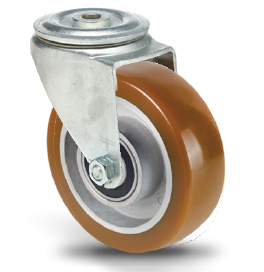 - Aluminium wheels with bonded-on round polyurethane tyre (Shore A 92) with two deep groove ball bearings and steel collar bushes external diameter 15/20/25 mm to internal 8/10/12 mm. Operating temperatures from -20°C to + 80°C