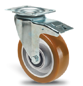- Aluminium wheels with bonded-on round polyurethane tyre (Shore A 92) with two deep groove ball bearings and steel collar bushes external diameter 15/20/25 mm to internal 8/10/12 mm. Operating temperatures from -20°C to + 80°C